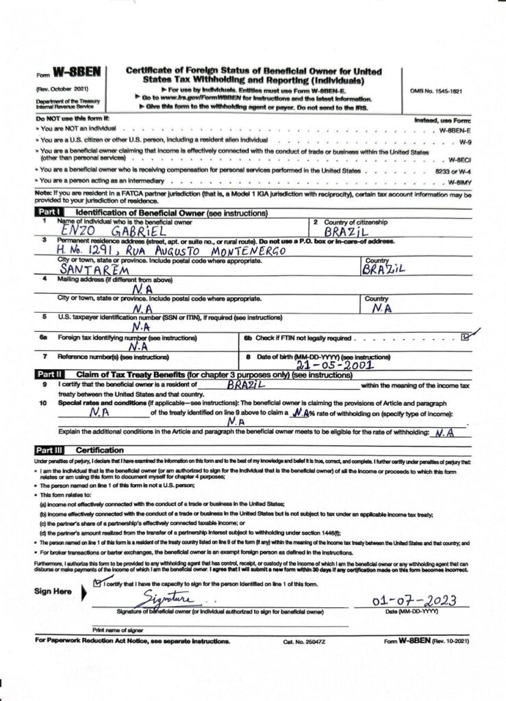 Sample W – 8BEN Form